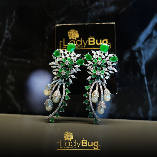 rhodium-plated, Zircon earrings in emerald color with pearls (LB-329)