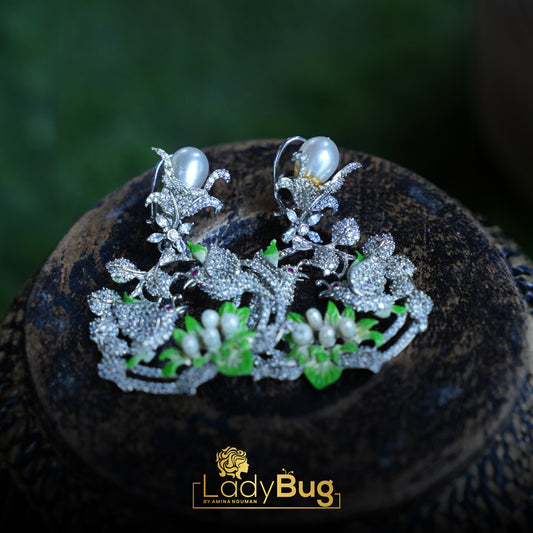 Rhodium-plated hand-painted earrings with pearls